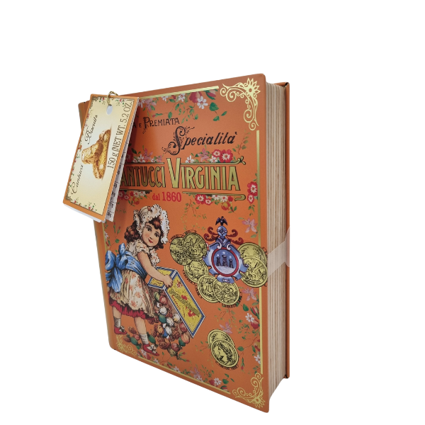 The Amaretti Virginia Cantucci are almond biscotti made using a traditional recipe to the company’s usual exacting standard. In Italy, cantuccini are traditionally served as a dessert or as a treat to accompany coffee and tea. Here they are presented in an exquisite tin ‘book’ featuring the nostalgic Amaretti Virginia image of a girl upending a box of sweets.