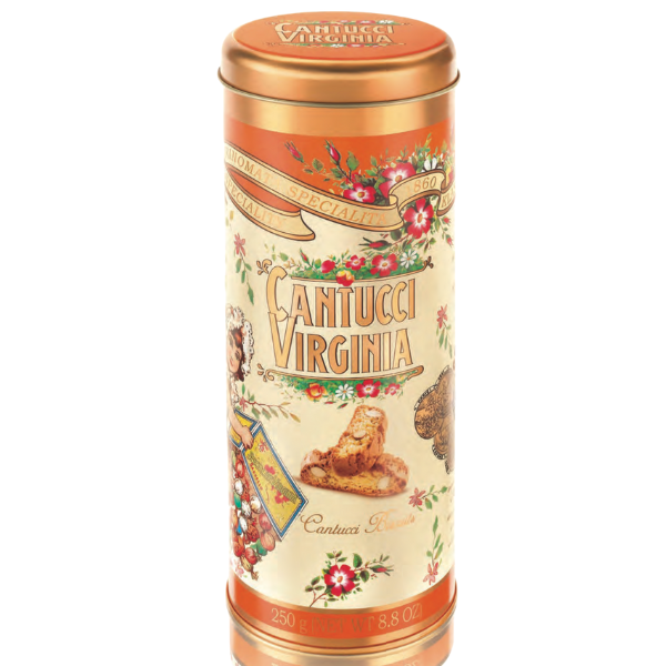 The Amaretti Virginia Cantucci are almond biscotti made using a traditional recipe to the company’s usual exacting standard. In Italy, cantuccini are traditionally served as a dessert or as a treat to accompany coffee and tea. Here they are presented in an exquisite tin ‘book’ featuring the nostalgic Amaretti Virginia image of a girl upending a box of sweets.