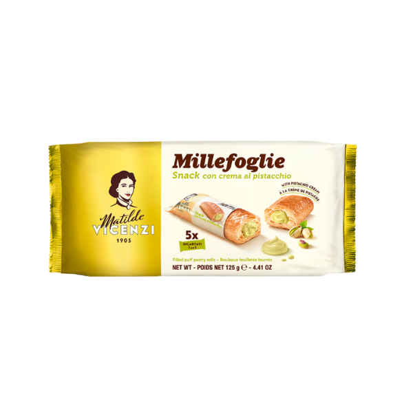 The Matilde Vicenzi Millefoglie with Pistachio Cream Snack contains five individually wrapped pastry snacks for that perfect ready-to-go sweet bite. Each snack features a delicate pistachio cream filling wrapped with that hallmark Vicenzi luxurious puff pastry.
