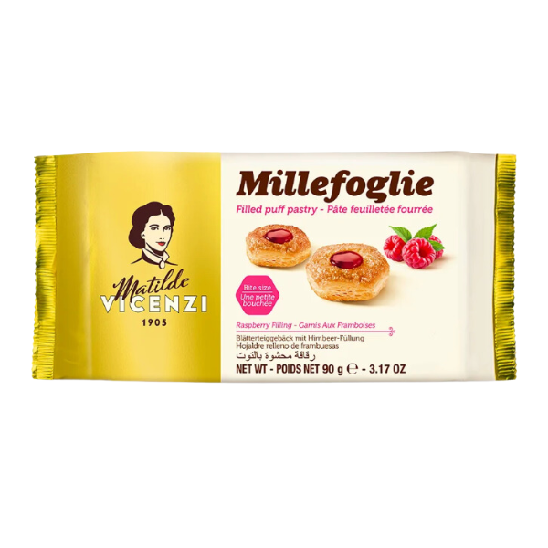 Matilde Vicenzi Raspberry Millefoglie wrap a delicious raspberry jam filling in 192 crispy and delicate layers of puff pastry and premium butter for a bite-size puff pastry treat that makes that makes every coffee break special.