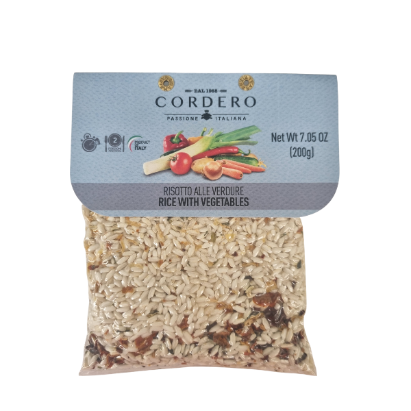 The 200g Cordero Vegetable Risotto is a ready-to-cook risotto combining premium Carnaroli rice from Piedmont with a vegetable extravaganza—carrots, tomatoes, onions, zucchini, leeks and parsley. This vegetarian risotto with its rich, creamy texture and perfectly balanced flavors is made with 100% natural ingredients. Just add your favorite hot broth, stirring occasionally until al dente. Finish your dish with some grated parmesan, a knob of butter, and some salt and pepper, and your gourmet meal is ready for the table.