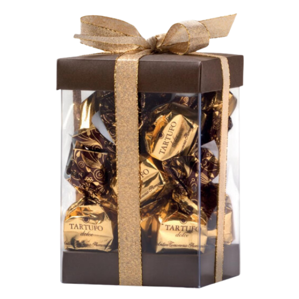 Presented in a transparent box wrapped with a ribbon are 12 Tartufi Dolce Neri truffles, the original sweet truffle, in a sparkling golden wrapper.