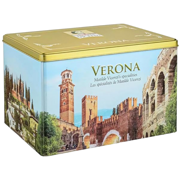A selection of cream-filled puff pastries, crunchy cookies as well as decorated shortbread pastries. Presented in a collector’s tin that depicts scenic views of Verona, the birthplace of Matilde Vicenzi as well as the city of Romeo & Juliet, making it the perfect gift to share with loved ones on special occasions. The biscuits are carefully packaged to prevent breakage and maintain flavour.